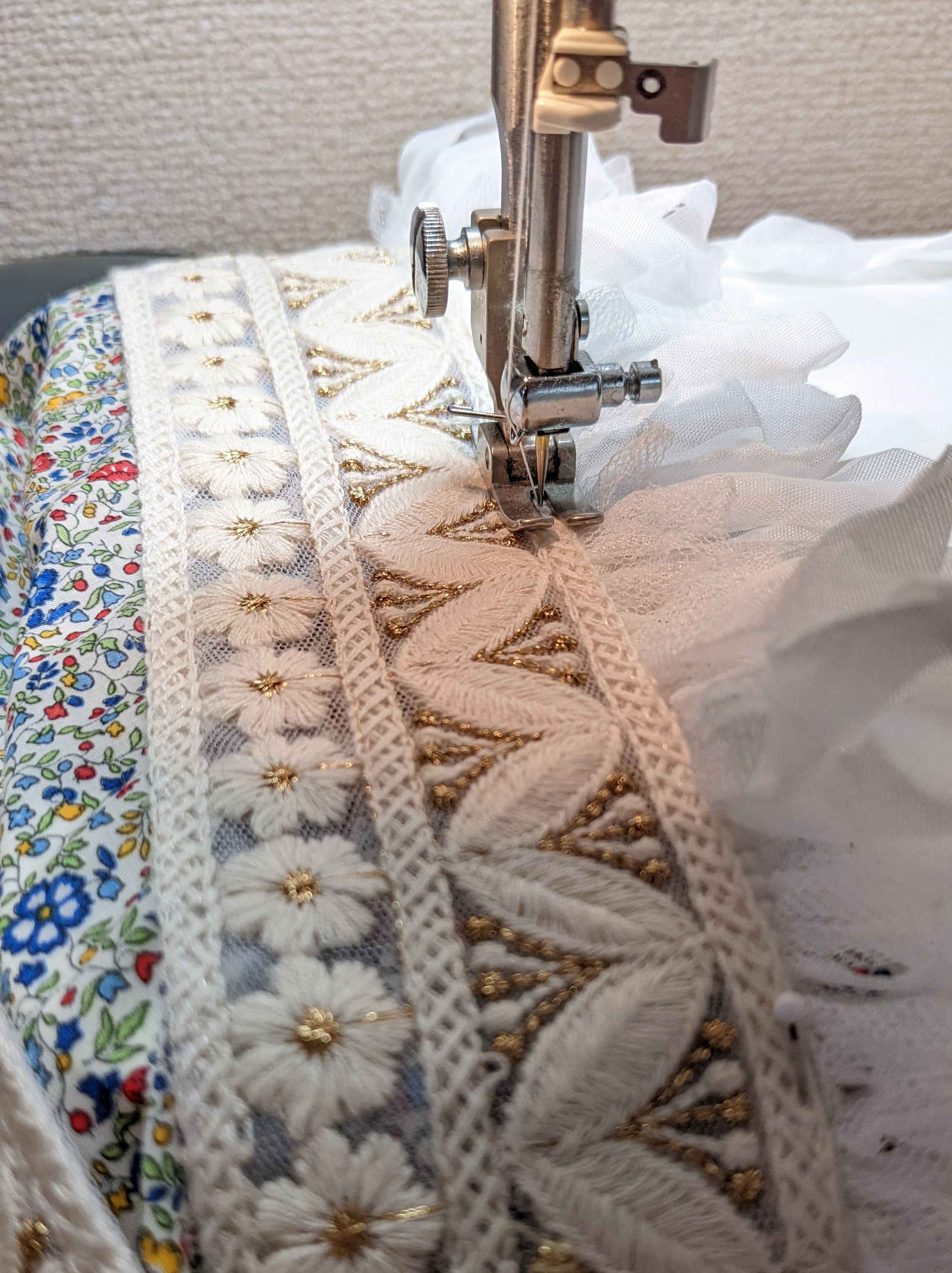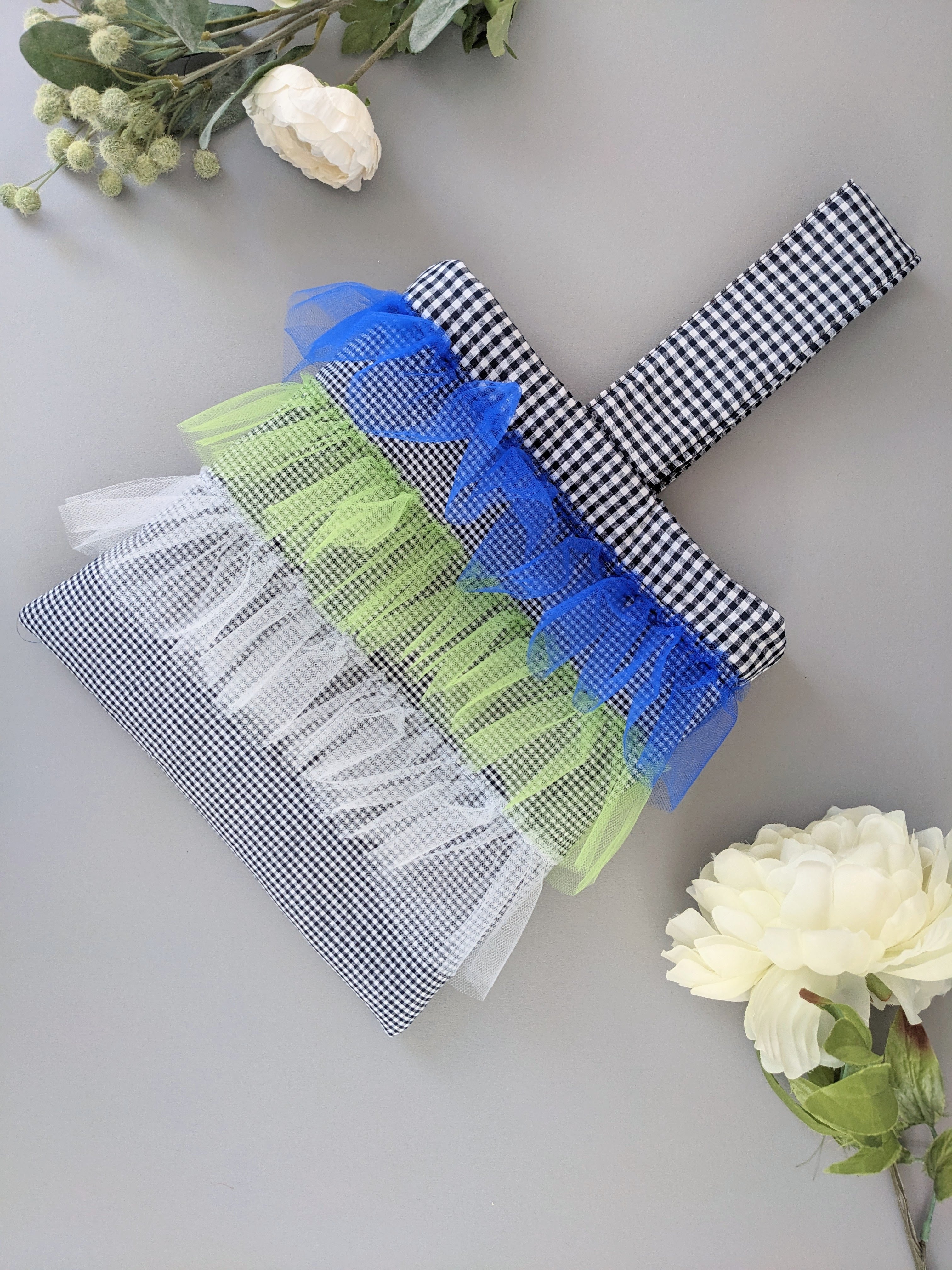 HOUKIバッグチュールやオーガンジー生地をフリルにして3段縫いしたデザインバッグ。ポップな箒のような形なのでHOUKIバッグと命名しました。