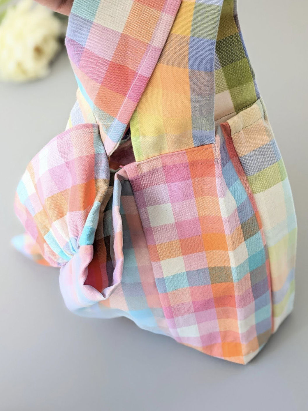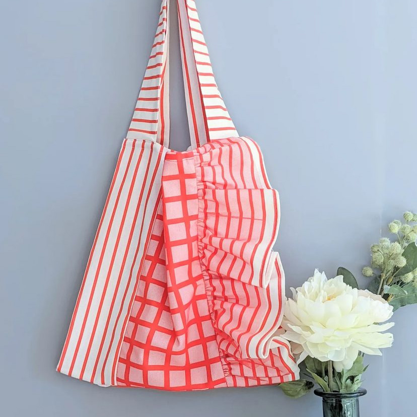 アシメフリルバッグたての柄とよこの柄。布を切りかえ、組み合わせ、見る方向によって表情の違うデザインバッグ。 生地も自らデザインしたこだわりのバッグです。